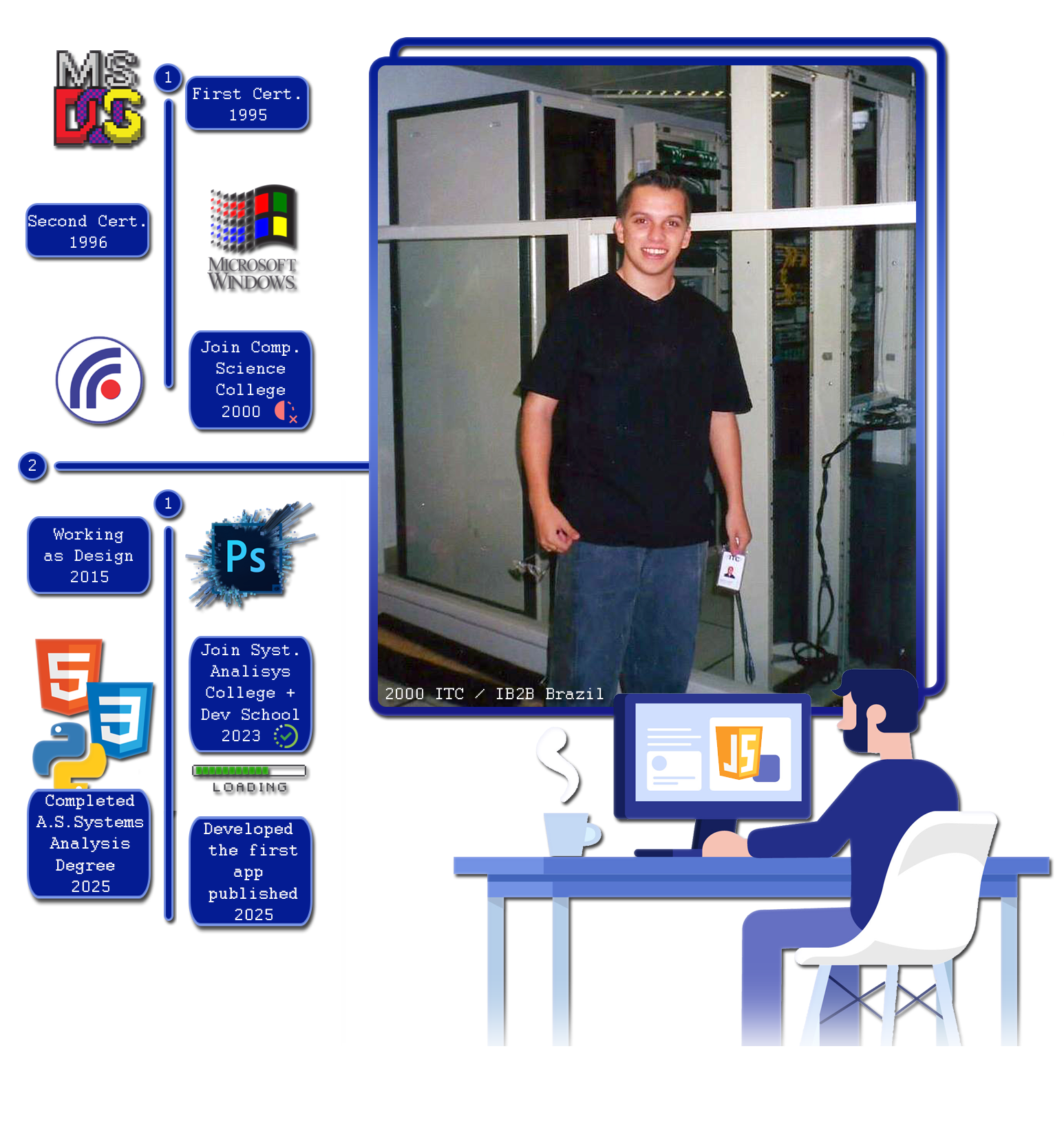 My passion for computers began with a 486, sparking a lasting fascination with technology. After studying Computer Science and facing academic challenges, I redirected to healthcare, developing strong communication skills. In the 2000s, I worked helpdesk support, managing tickets and servers, learning organization and teamwork. In 2015, I returned to IT focusing on design - logos, invitations, and business cards. Now in 2023, I've reentered IT with determination, having graduated in Systems Analysis and advancing my skills at Alura Dev School. Focusing on HTML, CSS, MySQL, and Python, I'm developing applications that combine technology and healthcare. Ready for collaboration opportunities to make a meaningful difference.